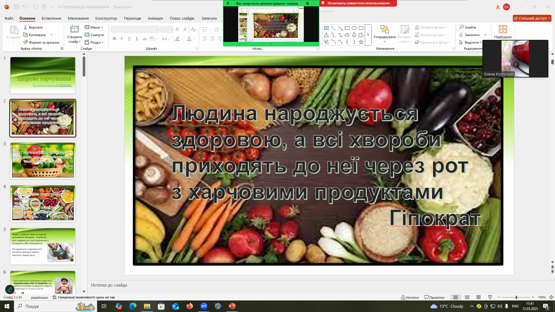12 березня 2025 року на кафедрі біології, здоров’я людини та фізичної реабілітації в рамках тижня факультету природничих наук та менеджменту відбулася Відкрита лекція на тему “Вплив здорового харчування на організм людини”, яку провела старший викладач кафедри Тетяна ПЛУЖНІКОВА. Ця лекція була організована з метою підвищення обізнаності студентів та викладачів щодо важливості дотримуватися правил здорового раціонального харчування, суть збалансованого харчування та його вплив на здоров’я людини.