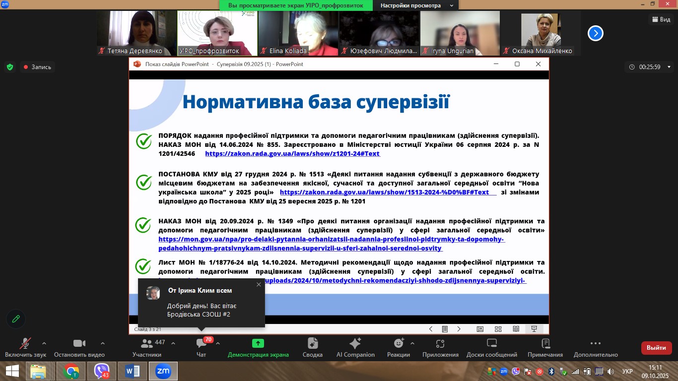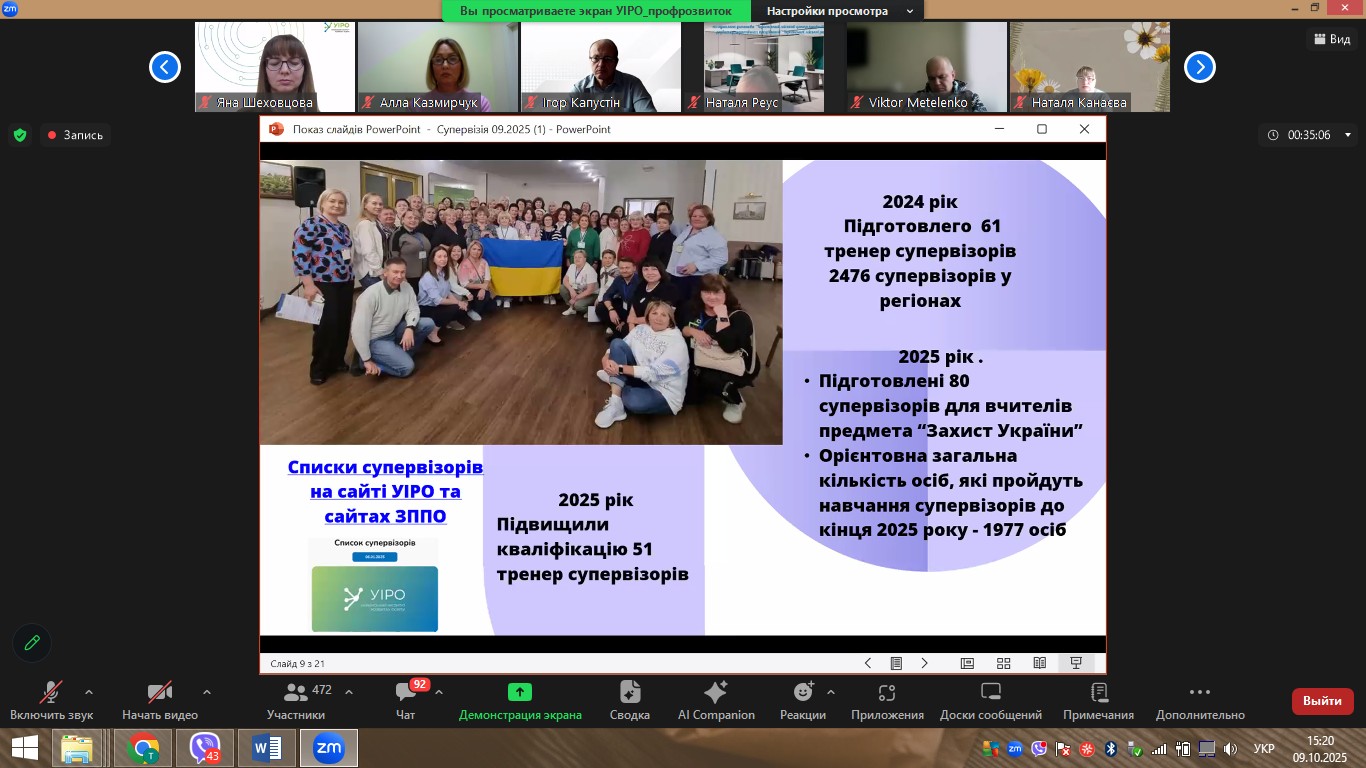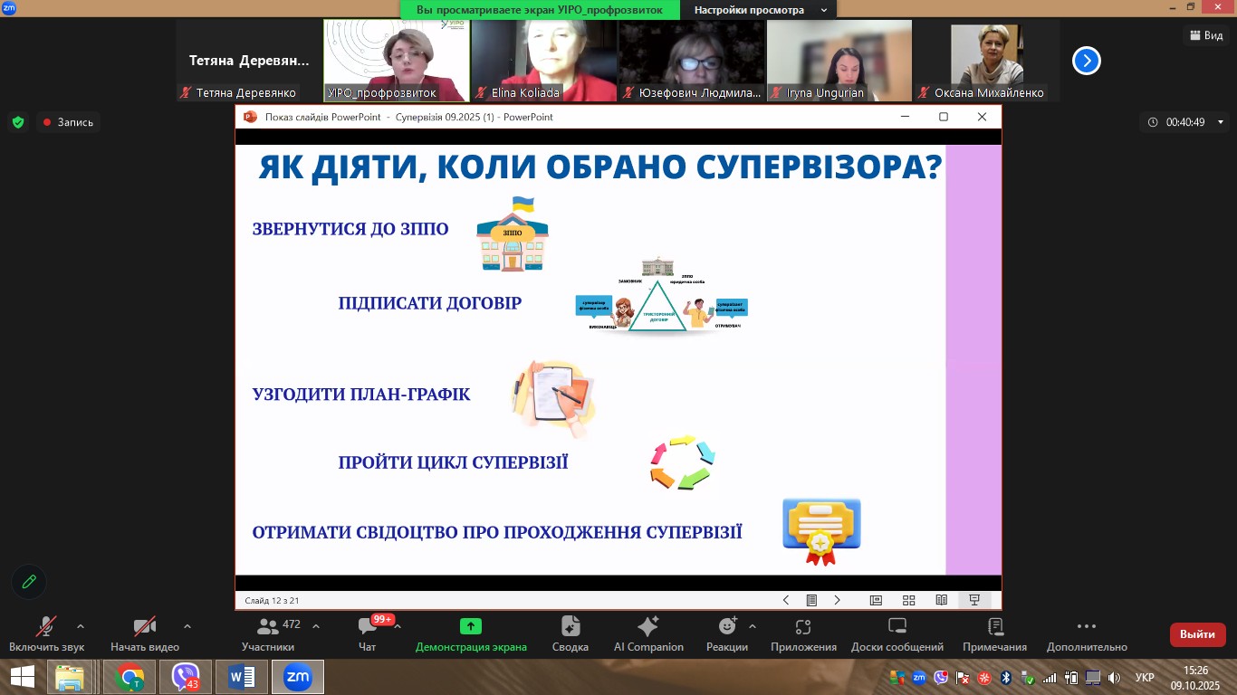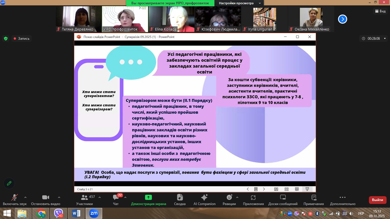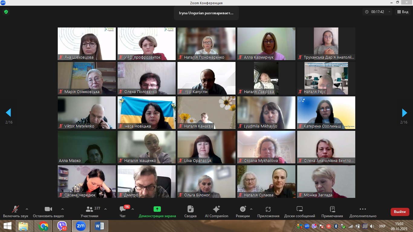 9 жовтня 2025 року викладачі кафедри біології, здоров’я людини та фізичної реабілітації разом зі здобувачами вищої освіти спеціальності «Середня освіта (Біологія та здоров’я людини)» бакалаврського та магістерського рівнів долучилися до вебінару «Супервізія для професійного зростання освітян», який відбувся в онлайн-форматі на платформі Zoom, за участю заступниці міністра освіти і науки України Надії Кузьмичової, експертів УІРО, супервізорів і представників ЗЗСО.