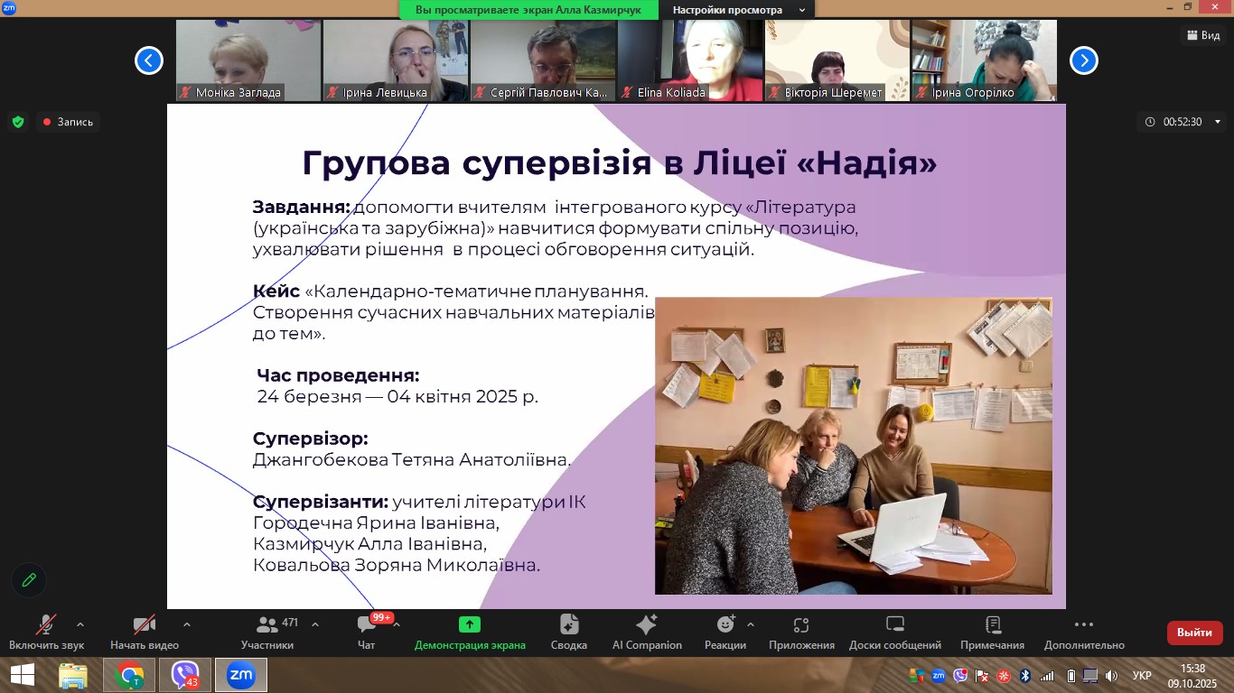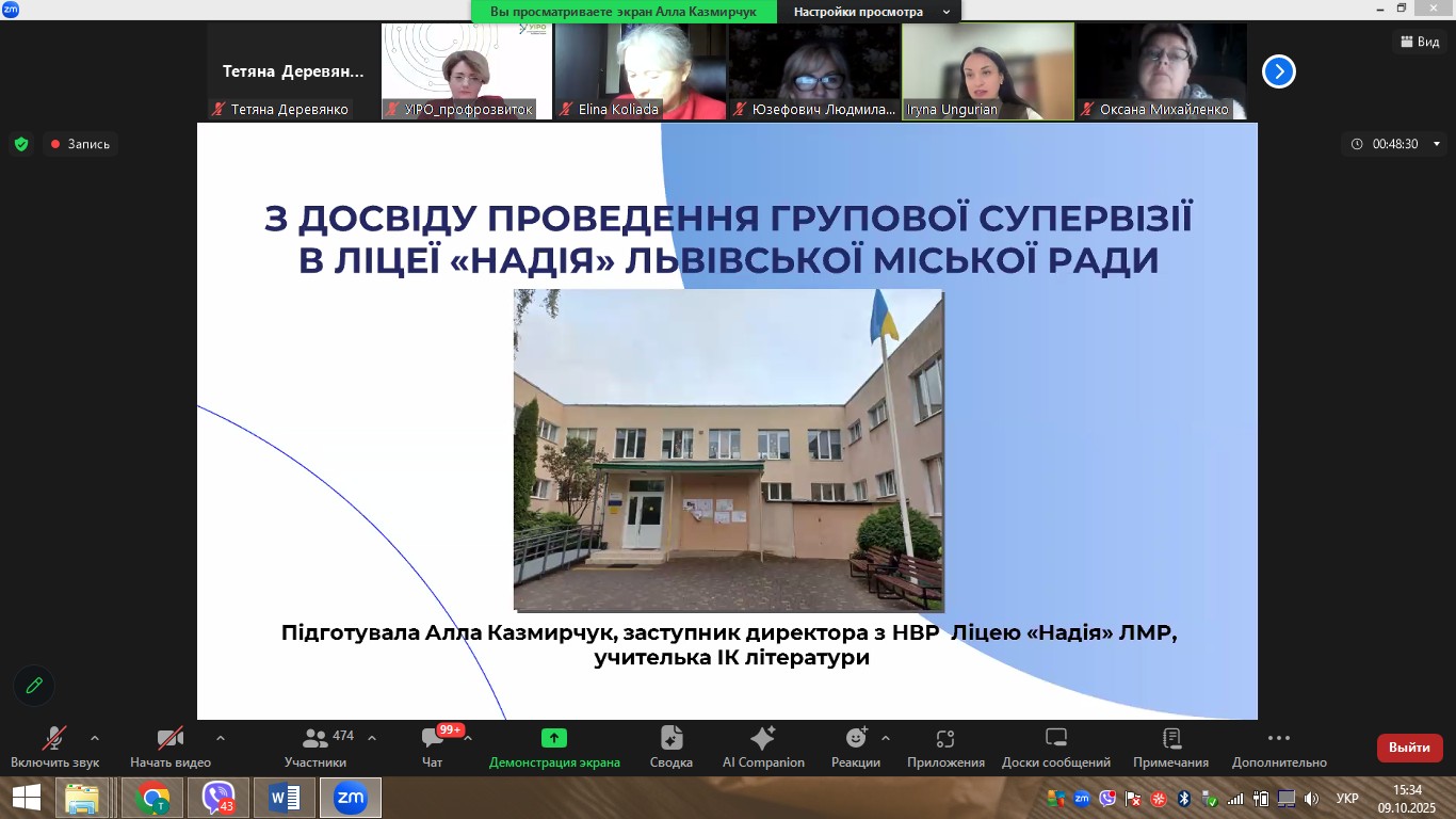 Спікер Алла Казмирчук, заступник директора з навчально-виховної роботи ліцею «Надія» Львівської міської ради поділилася досвідом проведення групової супервізії у відповідному закладі загальної середньої освіти.