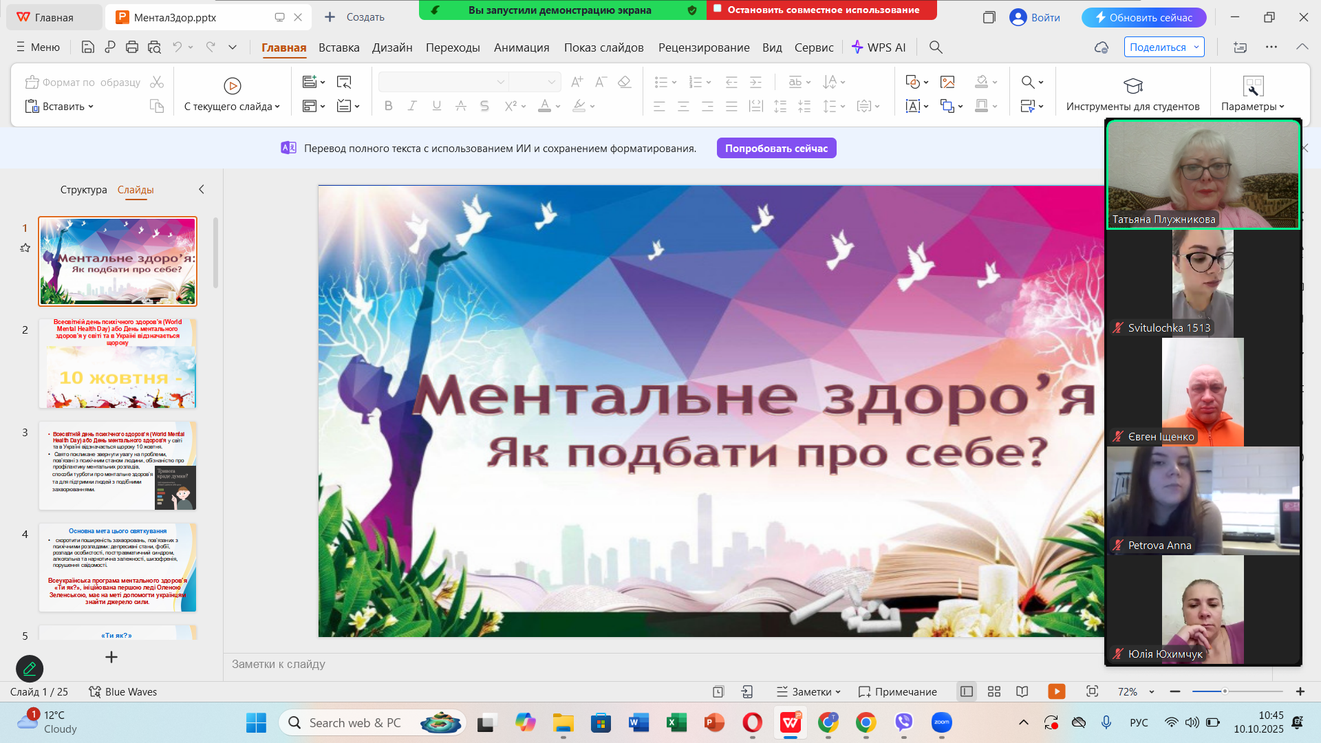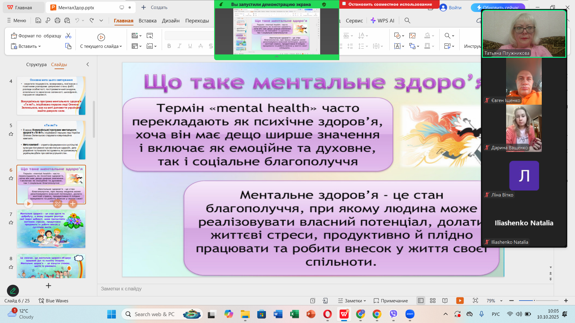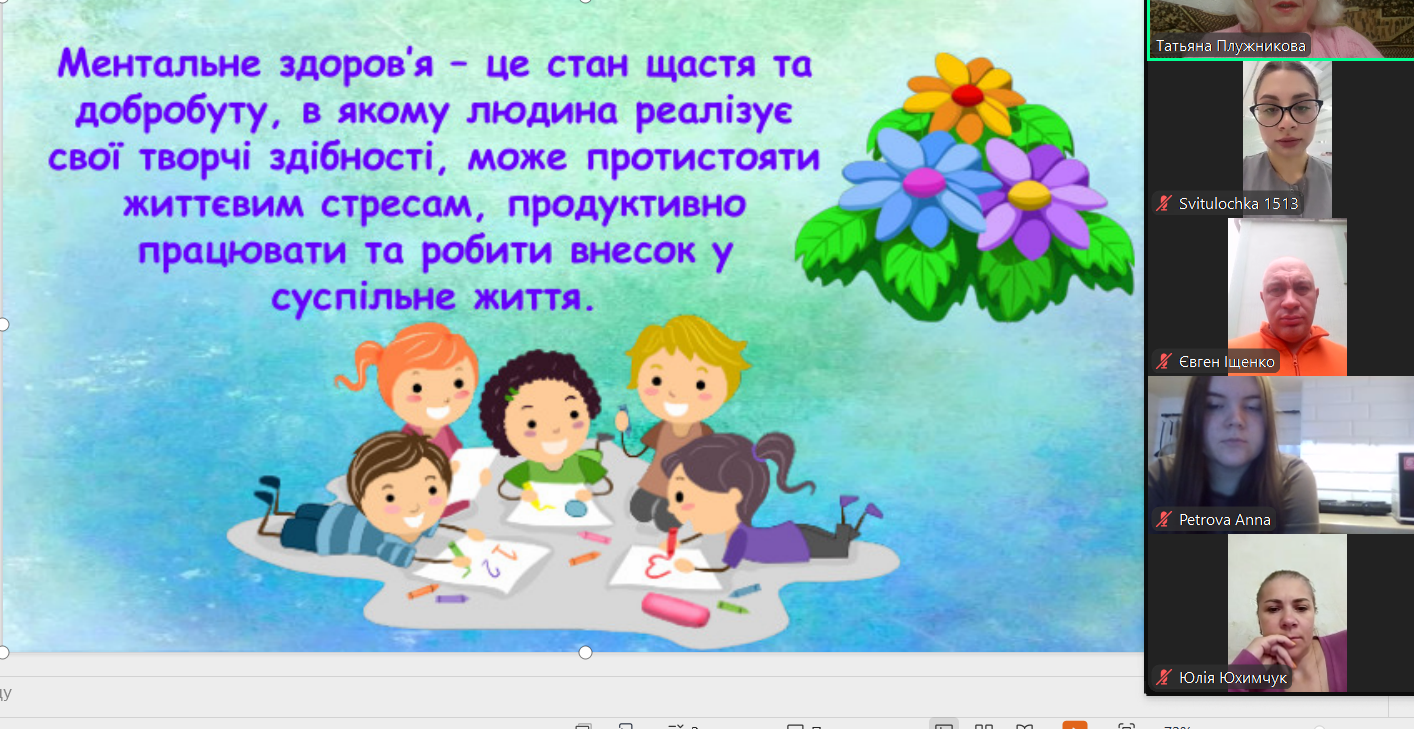 10 жовтня 2025 року до  Дня ментального здоров’я старший викладач кафедри біології, здоров’я людини та фізичної реабілітації Тетяна ПЛУЖНІКОВА в онлайн-форматі на платформі Zoom провела відкриту лекцію на тему «Ментальне здоров’я. Як подолати стрес» для здобувачів другого курсу першого (бакалаврського) рівня вищої освіти спеціальності «Середня освіта (Біологія та здоров’я людини)» та «Біологія та біохімія».