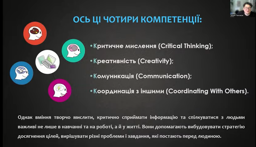 - фасилітативні вправи та розвиток навичок 4К,