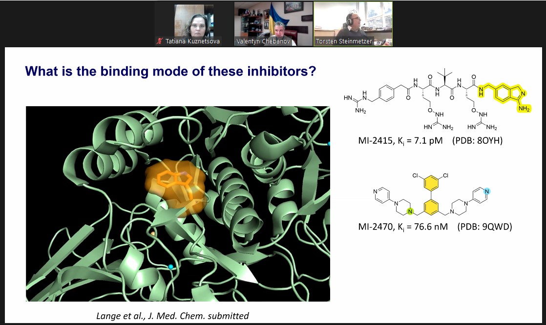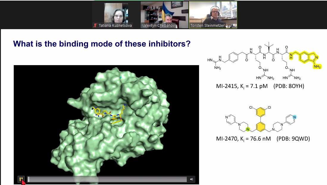 Професор Штайнметцер представив результати багаторічних досліджень своєї наукової групи, присвячених розробці, синтезу та визначенню інгібіторів протеаз. Зокрема, він пояснив, що фурин — це трансмембранна серинова протеаза типу I, яка належить до родини пропротеїнових конвертаз (ПК) і виконує важливі фізіологічні функції, активуючи попередники гормонів, ферментів і білків. Водночас, активність фурину пов’язана з розвитком низки захворювань, серед яких — рак, муковісцидоз та інфекційні хвороби, зумовлені активацією бактеріальних токсинів і вірусних глікопротеїнів. Професорсько-викладацький склад кафедри хімії та методики викладання хімії й студенти факультету природничих наук та менеджменту висловлюють щиру вдячність професору Торстену Штайнметцеру за надзвичайно змістовну, науково насичену та актуальну лекцію, яка сприяла розширенню наукового світогляду та мотивувала здобувачів освіти до подальшого професійного саморозвитку.