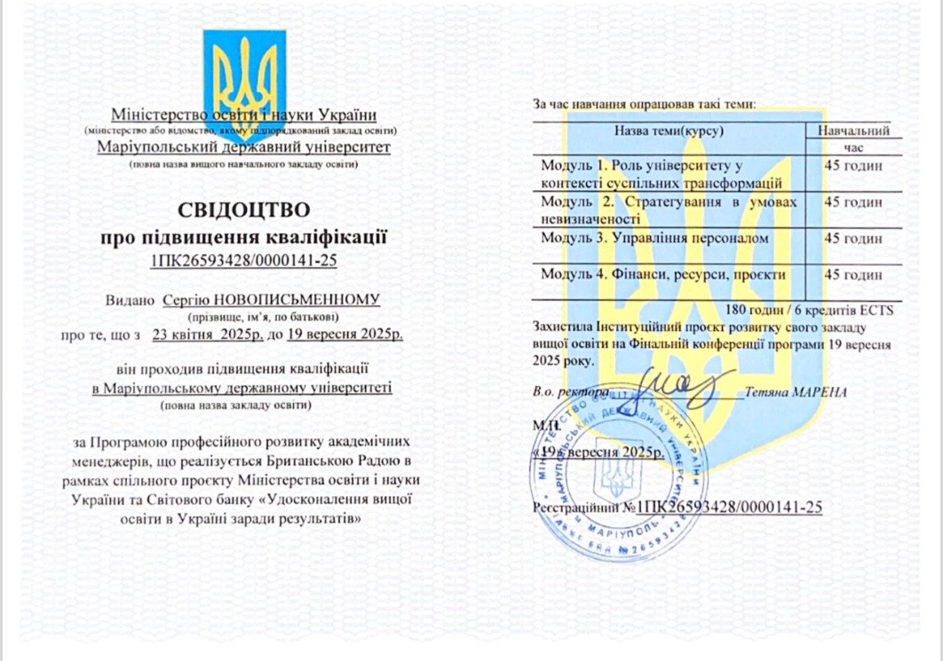 Навчання проходило з 23 квітня по 19 вересня 2025 р. на базі Маріупольського державного університету за програмою професійного розвитку академічних менеджерів, що реалізується Британською Радою в рамках спільного проєкту Міністерства освіти і науки України та Світового банку «Удосконалення вищої освіти в Україні заради результатів». Програма охоплювала широкий спектр актуальних тем: роль університету у контексті суспільних трансформацій; стратегування в умовах невизначеності; управління персоналом; фінанси, ресурси, проєкти.