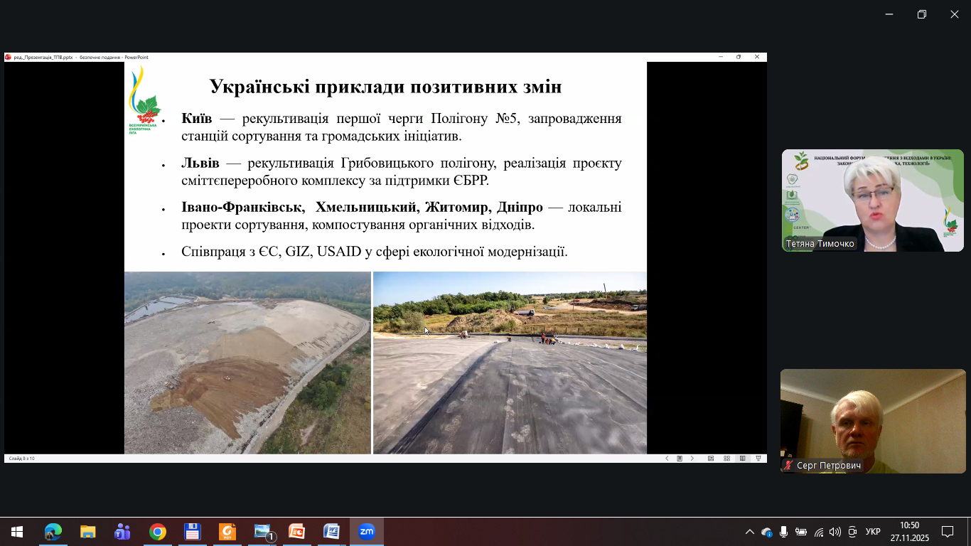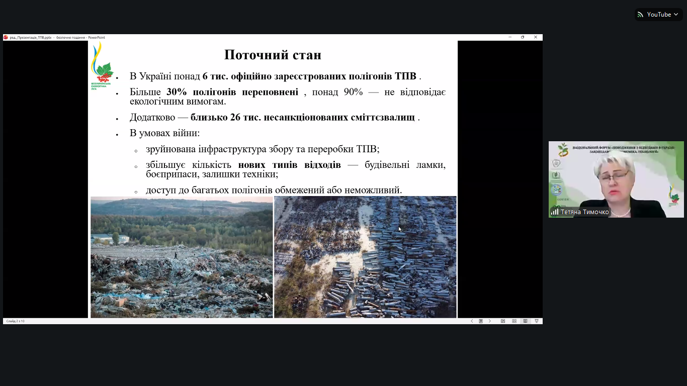 Така ключова тема 2025 року як полігони твердих побутових відходів та сміттєзвалища в умовах війни: стан, проблемні питання та шляхи впровадження європейських стандартів, піднімалася у виступах багатьох учасників, зокрема й заступниці Міністра економіки, довкілля та сільського господарства України Ірини Овчаренко, народного депутата України, голови Комітету ВРУ з питань екологічної політики та природокористування Олега Бондаренка.